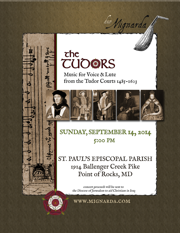 Discover the vibrant music of England's famously fascinating family, the Tudors. Join Mignarda at 5pm Sunday afternoon September 14th at the historic St. Paul's Episcopal Parish, Point of Rocks. More information at www.mignarda.com